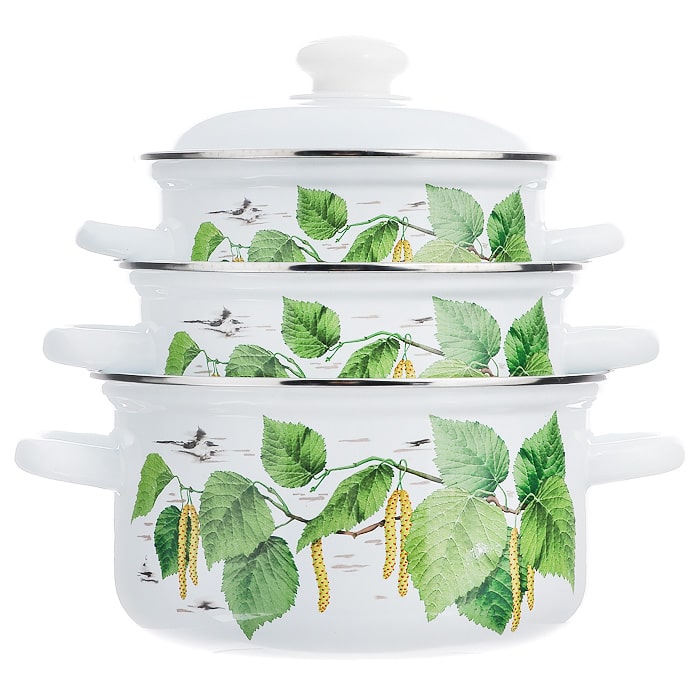 Кастрюли изготовлены из стали и покрыты эмалью, наружные стенки декорированы рисунком веток березы. Эмалевое покрытие имеет существенные преимущества по показателям безопасности влияния на организм человека, санитарным свойствам, простоте ухода и рассчитан на длительный срок эксплуатации. Оно устойчиво к перепадам температуры до 220°С, обладает высокой механической прочностью, противостоит воздействию пищевых кислот.
