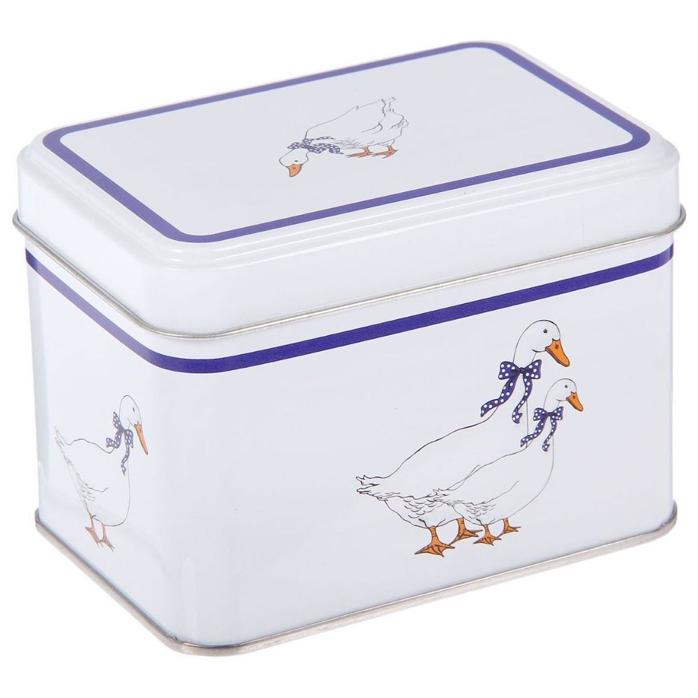 Банка "Гуси", изготовленная из металла, декорирована красочным изображением.