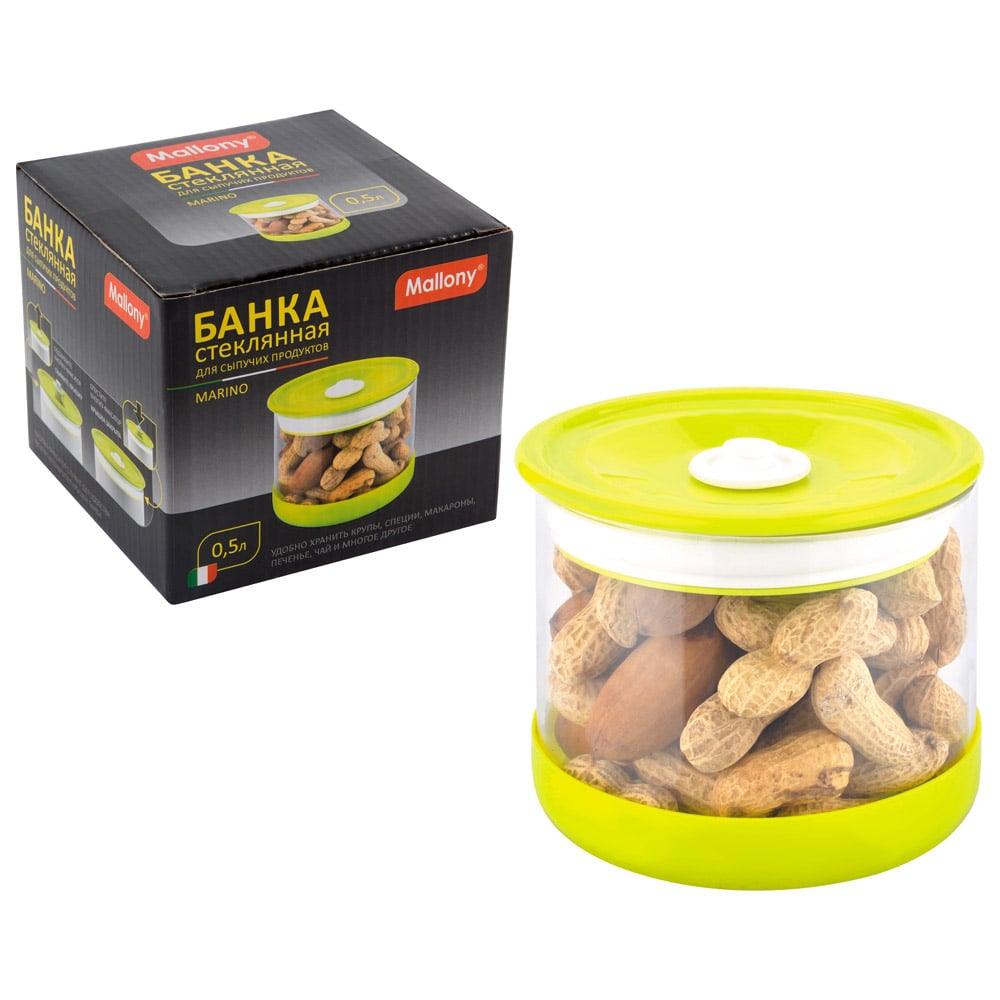 Стеклянная банка для сыпучих продуктов с крышкой из пластмассы, прокладка из силикона. Можно мыть в посудомоечной машине.