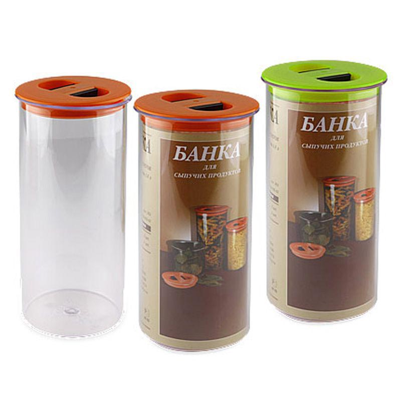 Банка для сыпучих продуктов изготовлена из прочного пластика и оснащена плотно закрывающейся пластиковой крышкой.