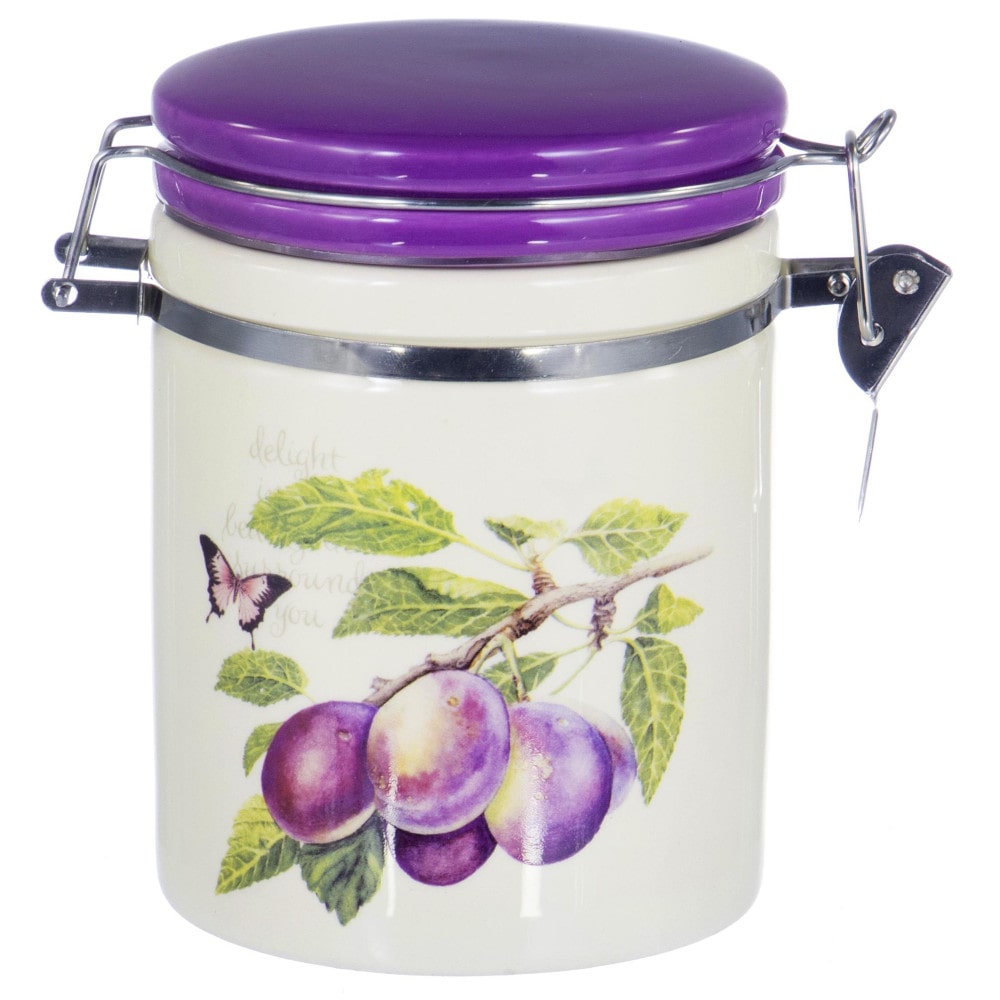 Банка для сыпучих продуктов "Слива" 730 мл с клипсой, декорирована яруим рисунком, упакована в подарочную коробку.