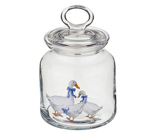 Банка для хранения герметично закрывается крышкой с удобной ручкой, поэтому посторонние запахи не попадут в емкость с содержимым продуктом. Декорирована задорным рисунком "Гуси".