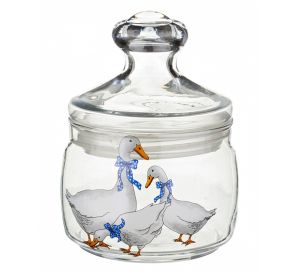 Банка для хранения герметично закрывается крышкой с удобной ручкой, поэтому посторонние запахи не попадут в емкость с содержимым продуктом. Декорирована задорным рисунком "Гуси".
