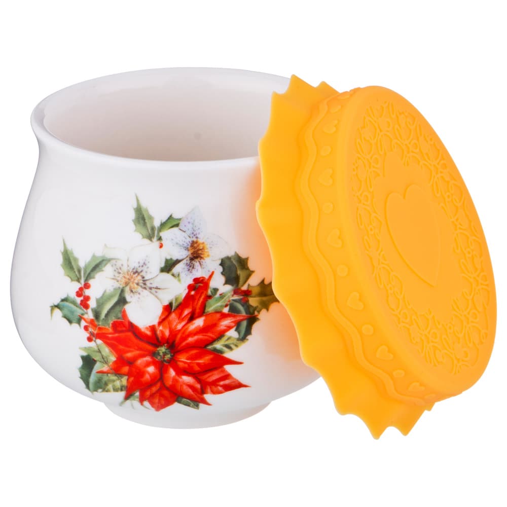 Оригинальная баночка для меда "Пуансетия" с силиконовой крышкой выполнена из высококачественного фарфора. Изделие предназначено для хранения меда, варенья или джема. Такой горшочек станет незаменимым аксессуаром на любой кухне.
