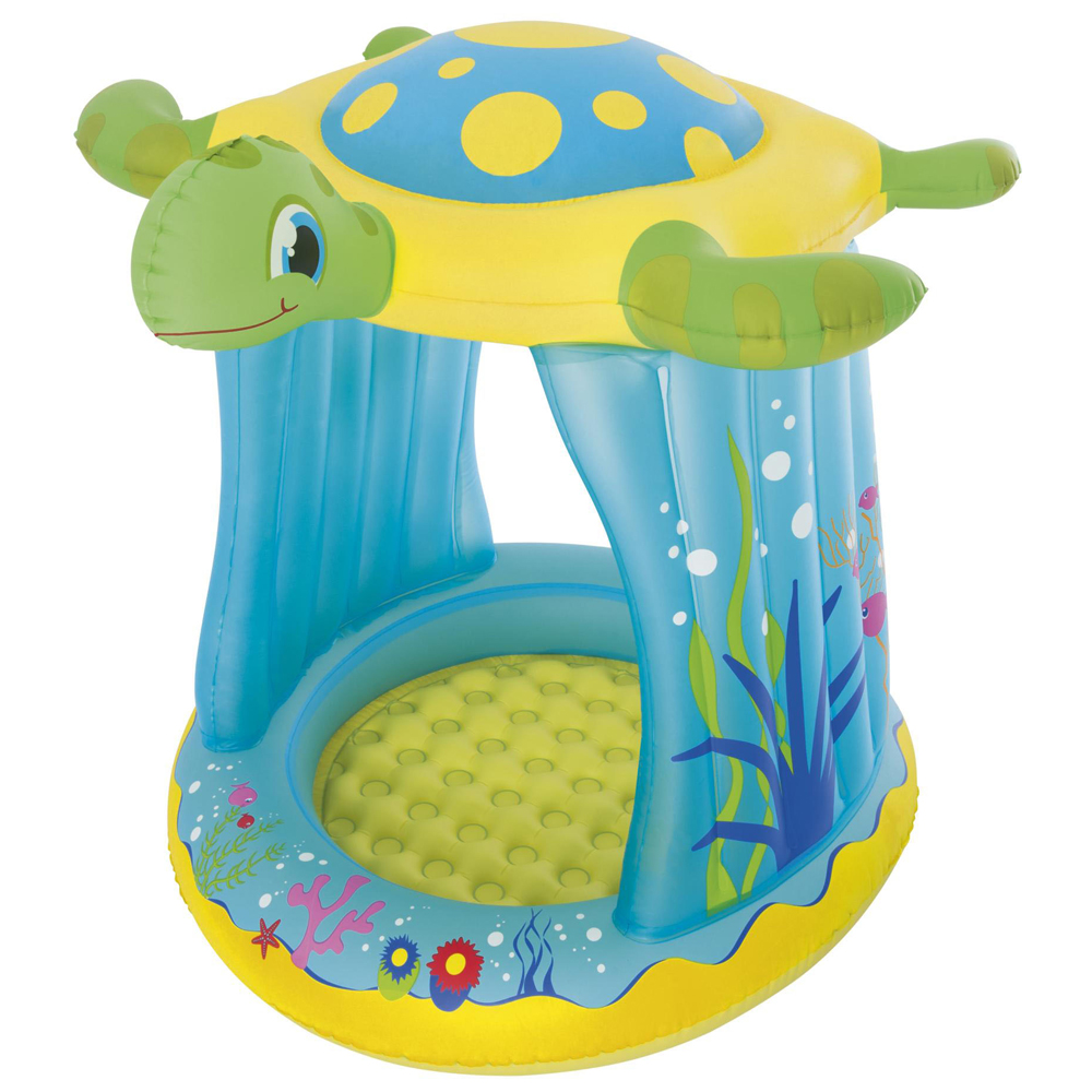 Бассейн с надувным дном Черепашка, словно магический грот, укроет юного принца или принцессу от солнца, порывов ветра и неровностей земли, позволит вдоволь бултыхаться и плескаться водой, заинтересует сияющей белизной и фантастическим декором. Придется пополнить запас резиновых уточек и других непромокаемых игрушек, детский бассейн для малышей обещает стать любимчиком вашего непоседы этим летом!