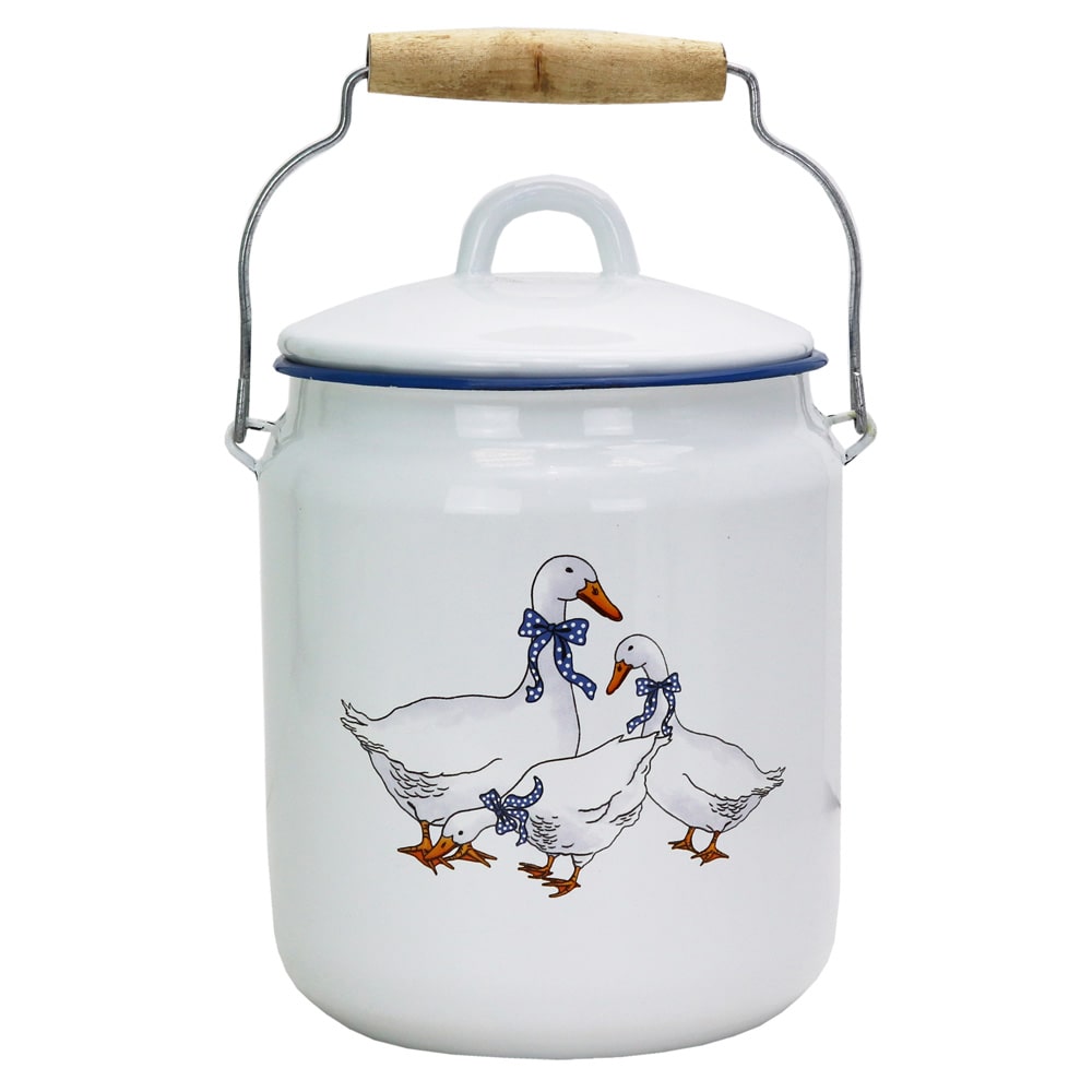 Бидон "Эмаль.Гуси" выполнен из высококачественного стального проката, покрытого жаропрочной эмалью. Такое покрытие защищает сталь от коррозии, придает посуде гладкую стекловидную поверхность и надежно защищает от кислот и щелочей.