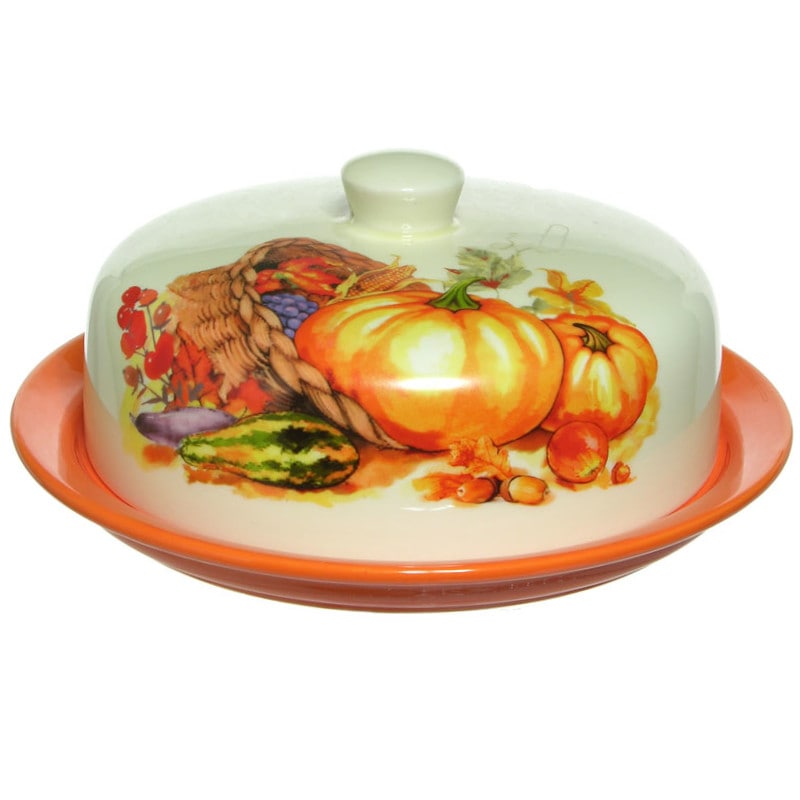 Керамическая блинница с крышкой в подарочной упаковке с узором Тыквы.