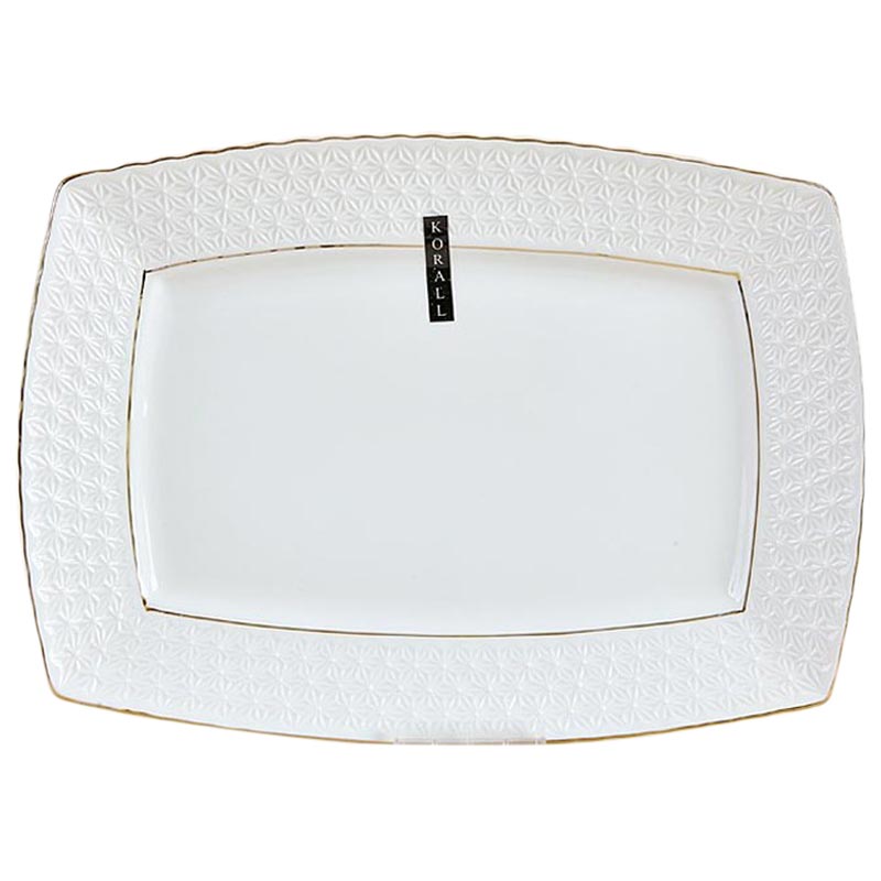 Блюдо прямоугольное из эксклюзивной коллекции чайно-столовой посуды "Снежная королева". Посуду отличает лёгкость, белоснежный цвет, отводка с содержанием 10-ти процентного настоящего золота, оригинальность формы и рельефа.