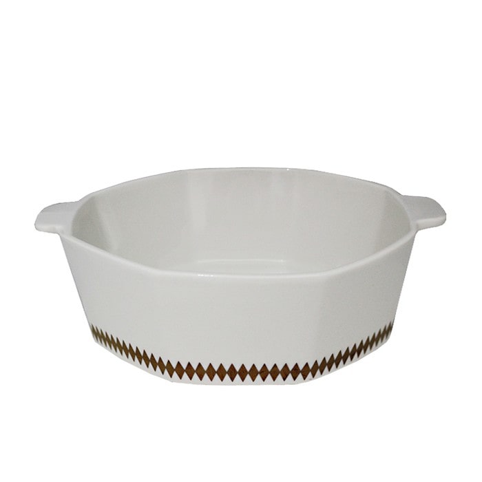 Серия Tekito изготовлена из высококачественного фарфора и представлена в двух цветах (черный и белый). Каждое изделие украшено по периметру узором из золотых ромбов. Отлично сочетаются друг с другом.