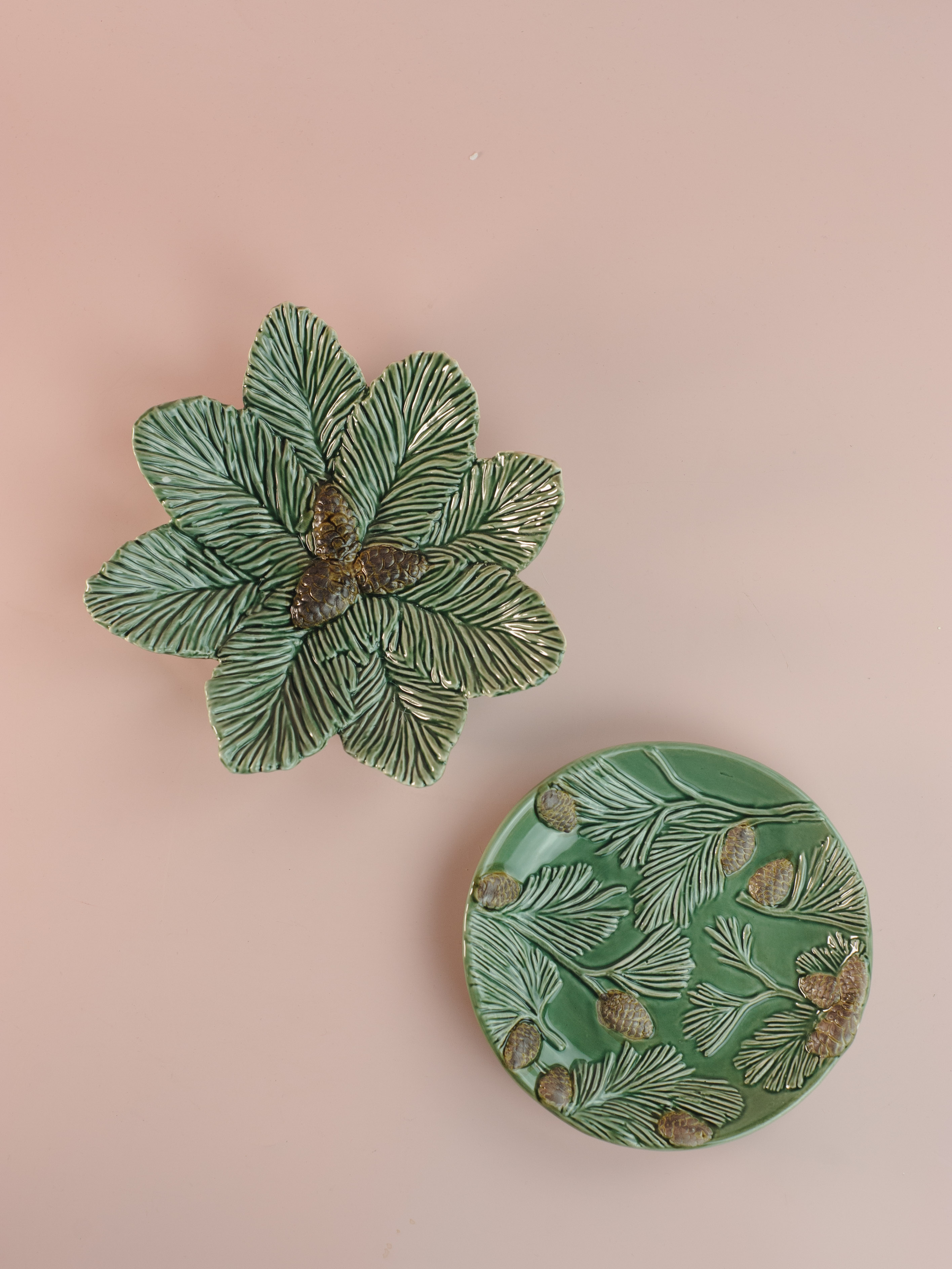 Наша посуда отличается насыщенными зелеными оттенками, которые ассоциируются с зимним лесом и свежестью природы. Объемные шишки и сосновые ветки, изящно оформленные на поверхности изделий, создают поистине волшебную атмосферу, способную перенести вас в сказочный лес. Эти элементы дизайна представлены с особым вниманием к деталям, что подчеркивает уникальность каждого изделия.
