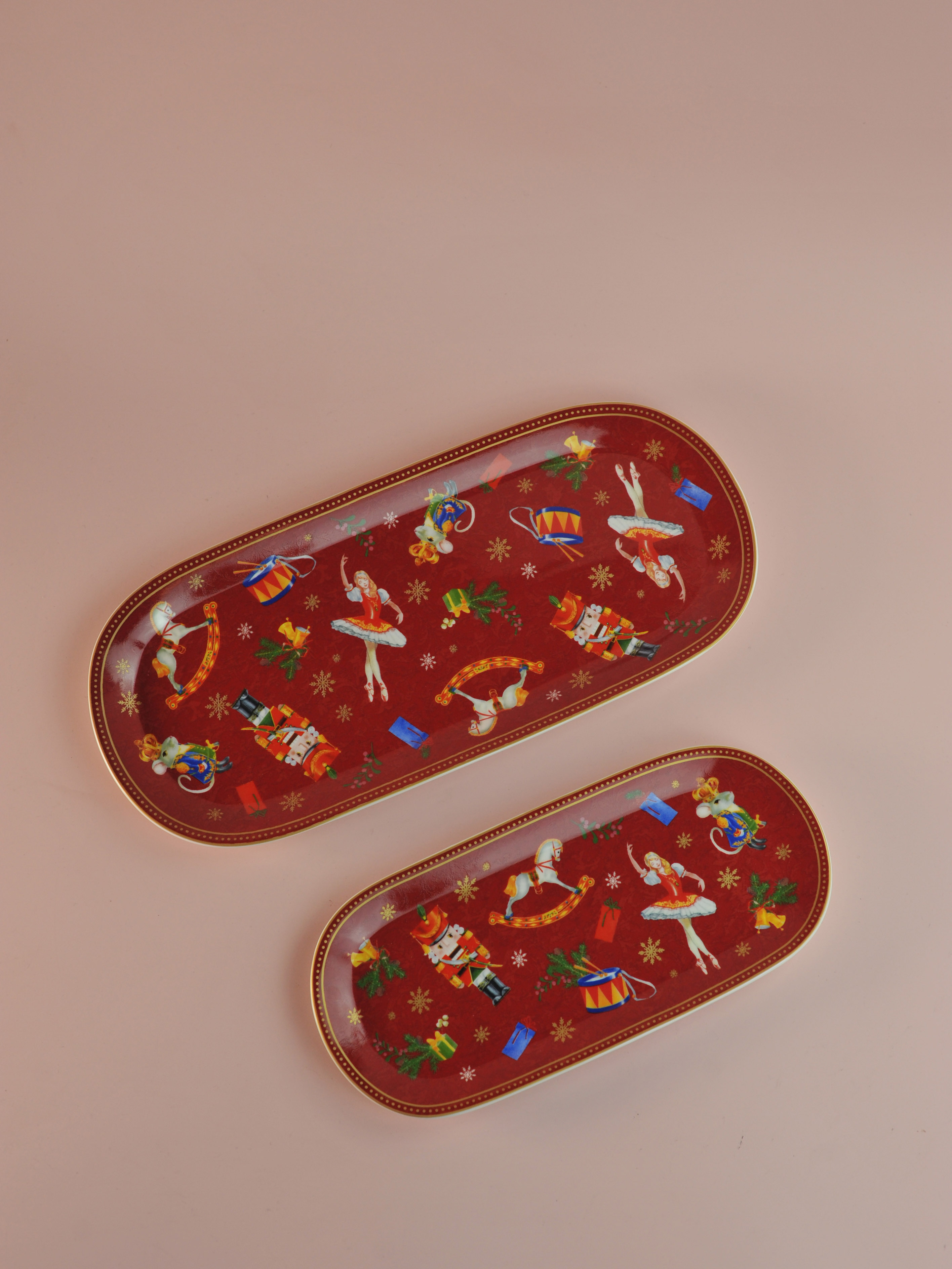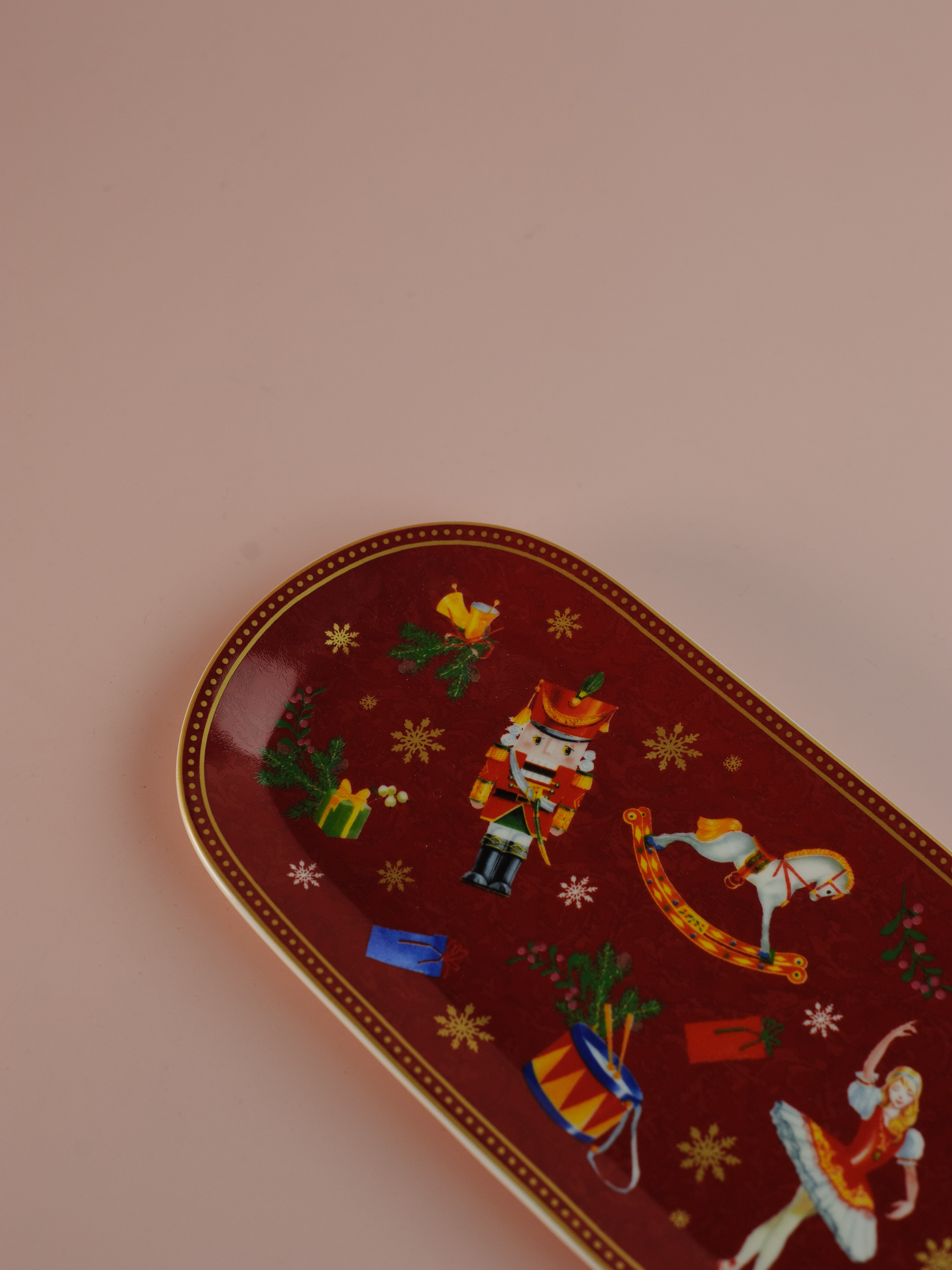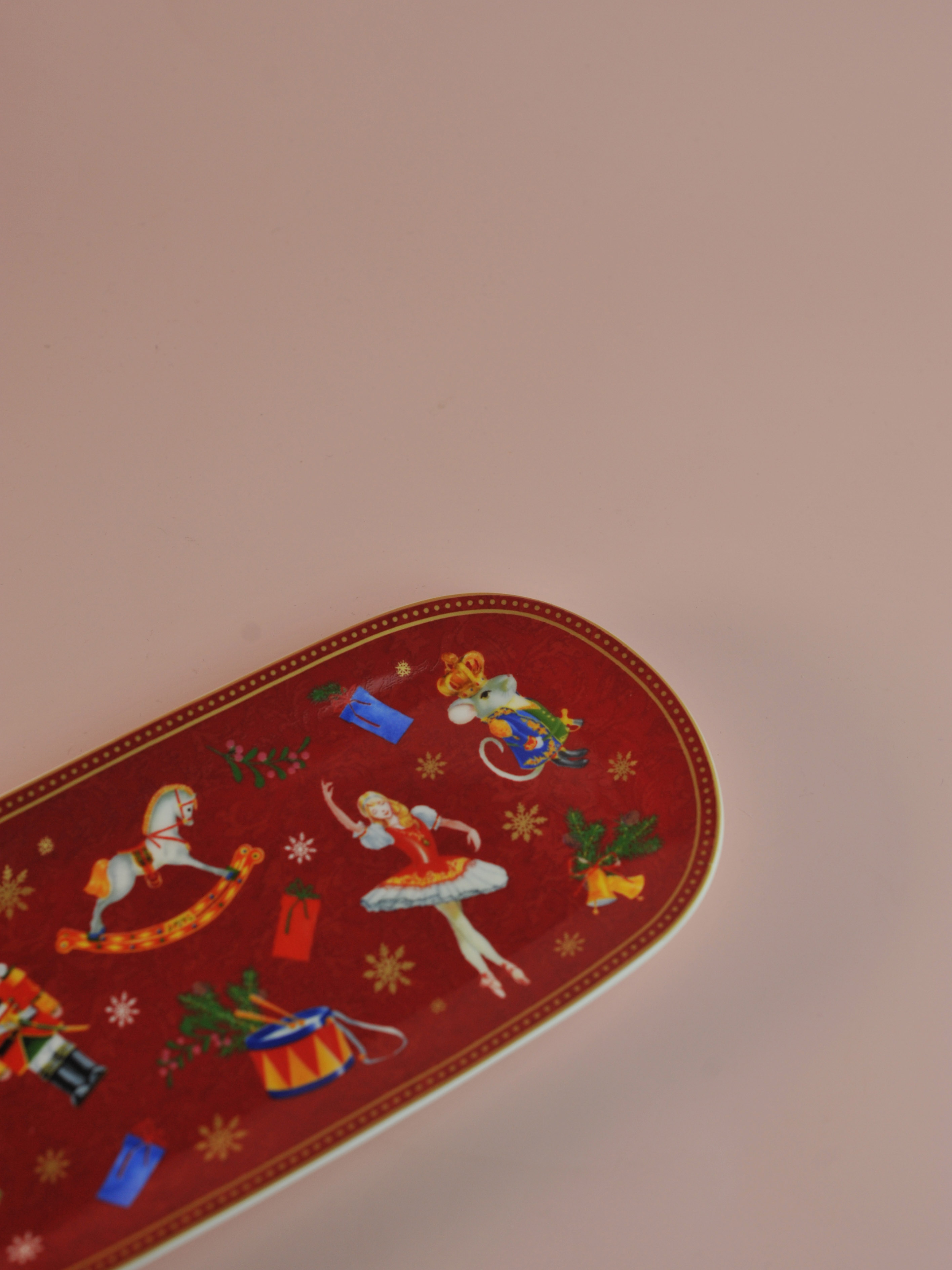 Овальное блюдо "Щелкунчик и Мышиный король" — это изысканный элемент сервировки, который станет прекрасным дополнением к вашему столу. Оно идеально подходит для подачи закусок, десертов или основных блюд, а также для украшения интерьера.