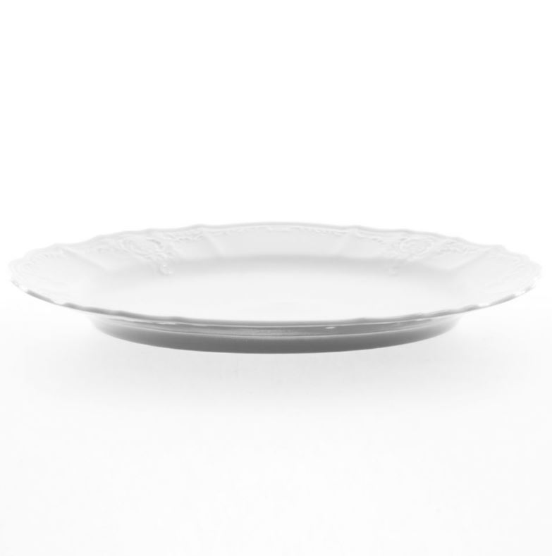 Блюдо изготовлено из высококачественного фарфора с высокой механической, химической и термической прочностью. По кайме нанесен объемный рисунок в виде кружева.