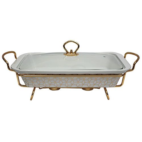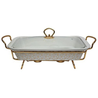 Прямоугольное блюдо изготовлено из жаропрочного фарфора, предназначено для приготовления или сохранения пищи в подогретом виде.