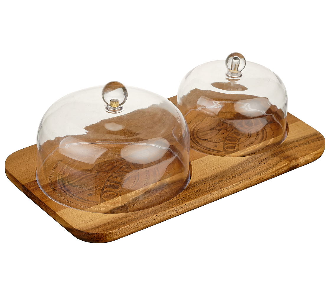 Блюдо сервировочное для подачи украсит собой праздничный стол или отлично подойдет для пикника. Блюдо можно использовать как доску для сервировки, а также защитить продукты от заветривания или попадания пыли и насекомых, если Вы отдыхаете на природе. Оригинальное блюдо выполнено в стильном дизайне отлично подойдёт для подачи закусок, фруктов, мясных блюд, десертов, сыров и многого другого. Так же на нём удобно хранить продукты в холодильнике, две прозрачные крышки сохранят Ваши закуски от заветривания и посторонних запахов. Доска выполнена из древесины акации, крышки из прочного прозрачного пластика. Размер блюда 34*20*12 см. Диаметры крышек 17 и 13 см.