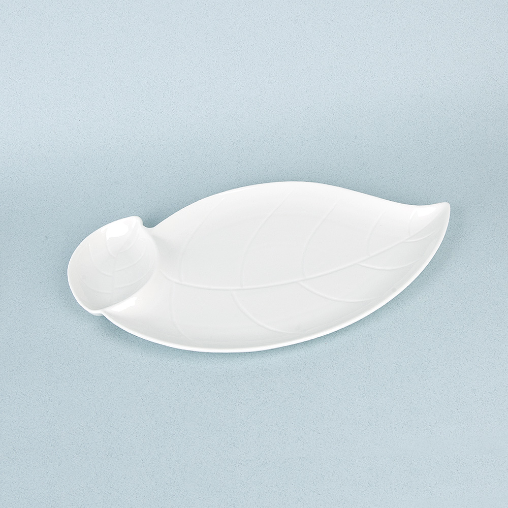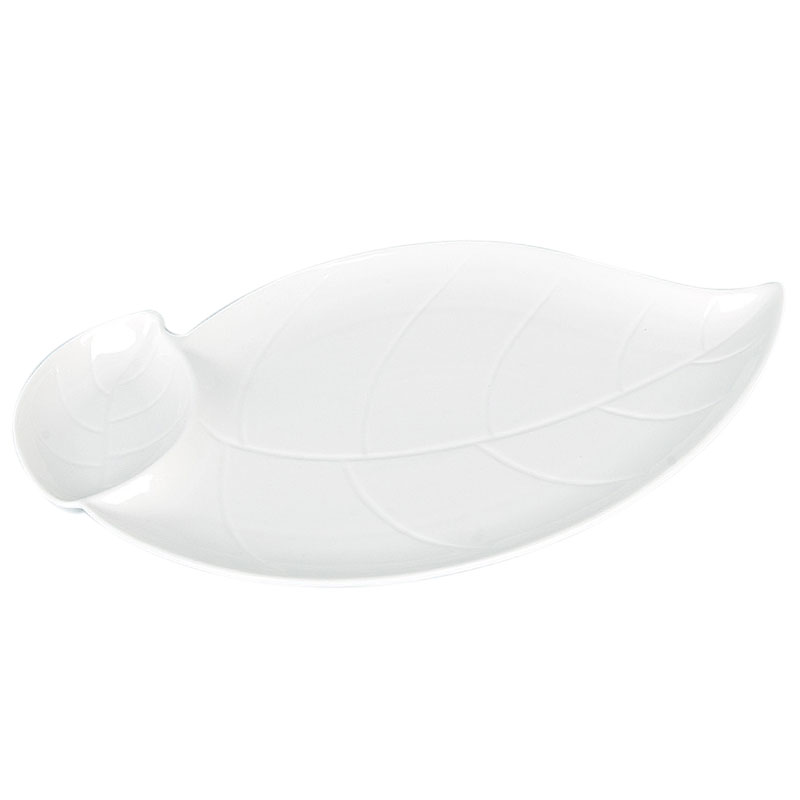 Блюдо сервировочное "Маршмеллоу" изготовлено из белого фарфора в виде листа растения. Подходит для подачи закусок и десертов. Можно мыть в посудомоечной машине.