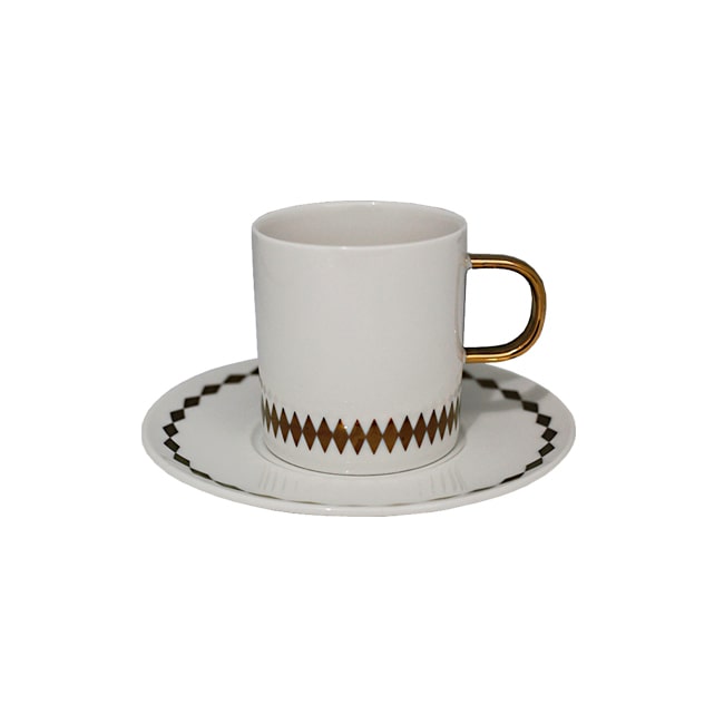 Серия Tekito изготовлена из высококачественного фарфора и представлена в двух цветах (черный и белый). Каждое изделие украшено по периметру узором из золотых ромбов. Отлично сочетаются друг с другом.