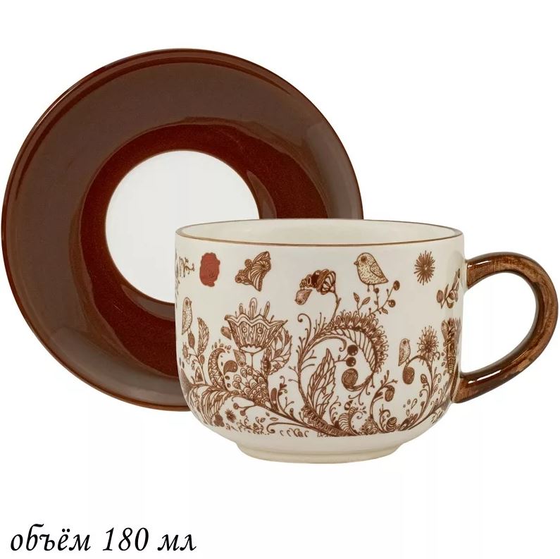 Коллекция керамической посуды выполнена в эксклюзивном запатентованном дизайне "Птичий дворик". В ассортименте полная сервировка стола и аксессуары для кухни. Керамика высокого качества, над глазурная деколь, эмаль молочного цвета в сочетании с шоколадного цвета дизайном.
