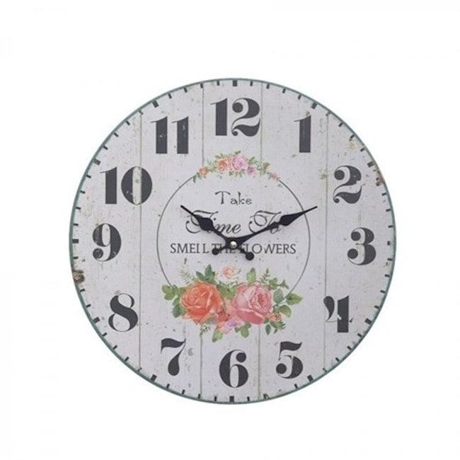 Циферблат белый круглый с черными арабскими цифрами, декорирован рисунком, стиль Шебби-шик.
