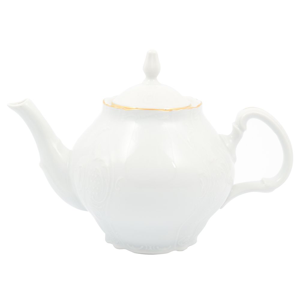 Чайник выполнен из прочного фарфора белого цвета с золотой отводкой.