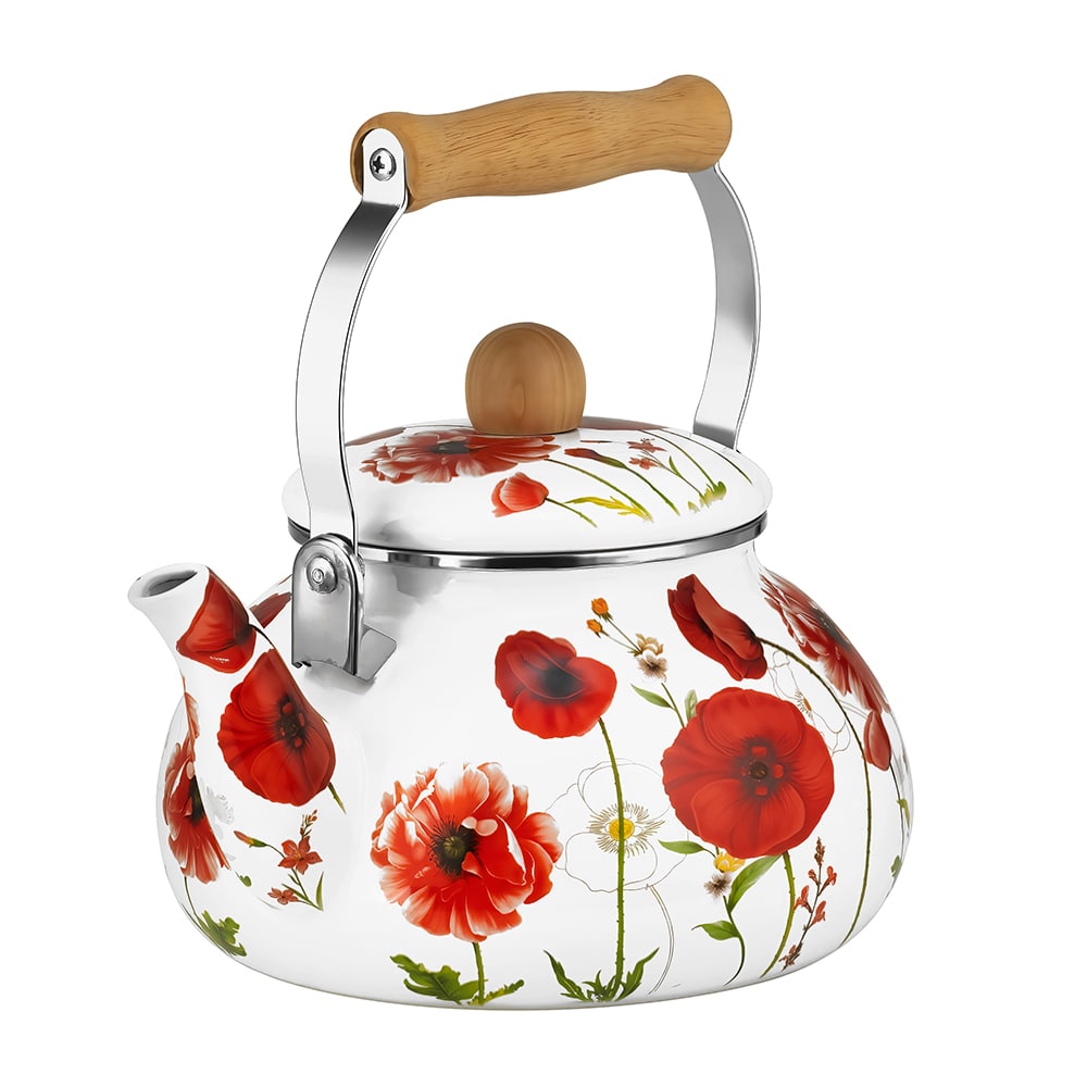 Эмалированный чайник LARA 2,2 л с элегантным дизайном и цветочной деколью – это экологичный помощник на Вашей кухне. Широкая горловина для удобного залива воды. Чайник изготовлен из углеродистой стали SPCC, а корпус покрыт трёхслойным эмалированным покрытием внутри и снаружи.