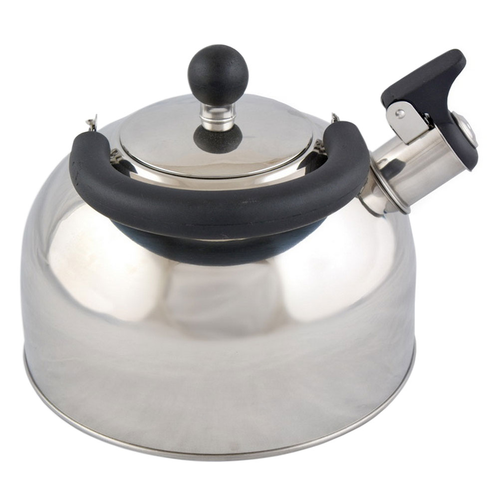 Чайник изготовлен из высококачественной нержавеющей стали. Бакелитовые ручки чайника практически не нагреваются, а курковый механизм позволяет легко поднимать насадку-свисток. Широкое цельнометаллическое однослойное дно распределяет тепло равномерно по всей поверхности, что обеспечивает быструю скорость закипания воды и устойчивость изделия. Подходит для всех видов плит, кроме индукционных.