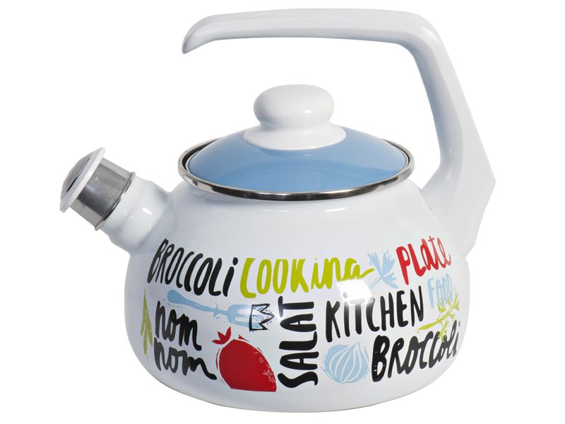 Чайник Metrot "Брокколи" со съемным свистком и консольной ручкой оформлен в ярком дизайном - забавные надписи по корпусу и цветная крышка.