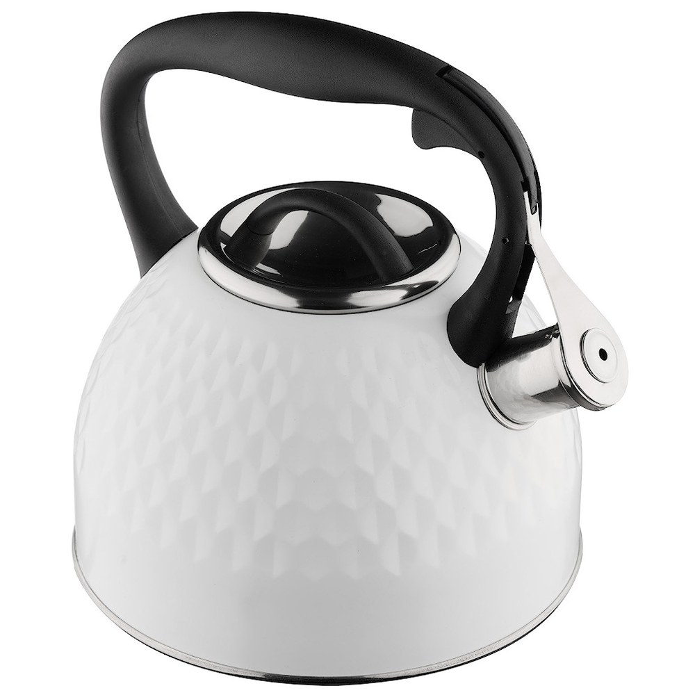 Чайник ТМ Катунь выполнен из безопасной и экологичной нержавеющей стали, декорирован с наружной стороны узором ромбы и белым декоративным покрытием.