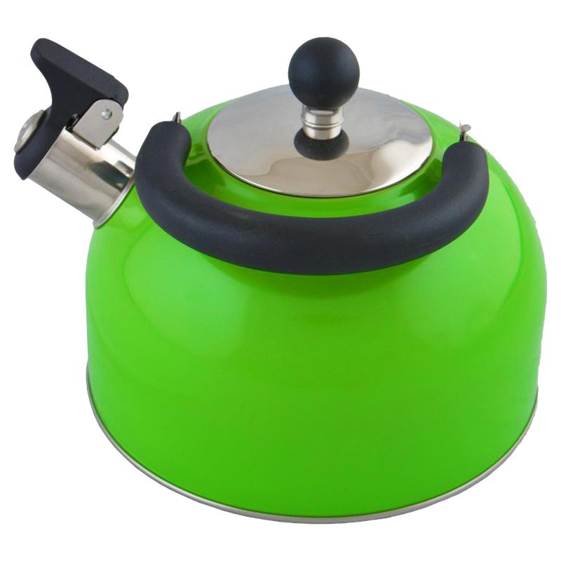 Чайник 2,5 л оборудован свистком для определения закипания воды и изготовлен из высококачественной нержавеющей стали. Корпус из стали долговечен, не подвергается коррозии и обладает антиаллергенными свойствами. Подвижная ручка модели очень удобна и не нагревается, так как изготовлена из бакелита. Широкое цельнометаллическое дно распределяет тепло равномерно по всей поверхности, что обеспечивает быструю скорость закипания воды и устойчивость изделия. Герметичная крышка не пропускает пар, поэтому вода долго остается горячей. Изящная форма чайника, яркая расцветка и зеркальная поверхность корпуса придают ему эстетичности на столе.
