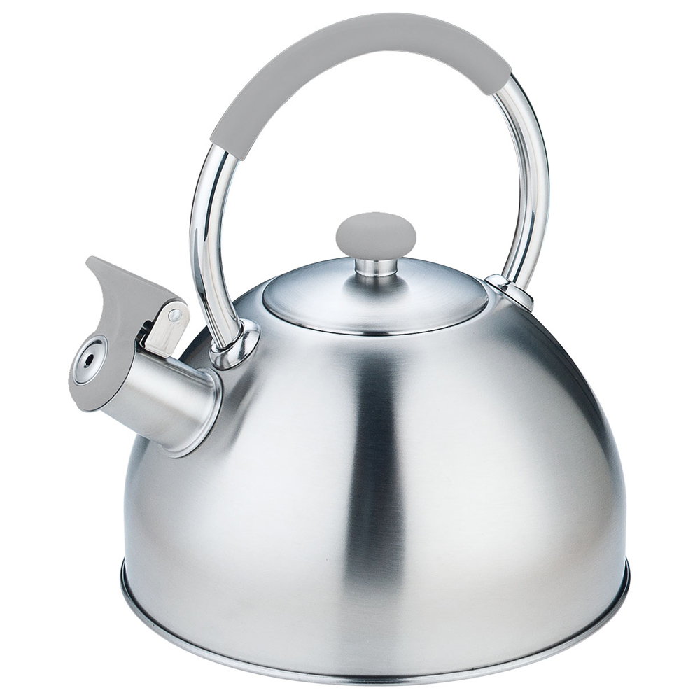 Чайник отлично дополнит ваш набор посуды. Произведен из нержавеющей стали. Небольшой чайник объемом 2,5 л оснащен свистком, подающим сигнал во время закипания воды. Рукоять чайника пластиковая с покрытием soft-touch. Свисток с силиконовой вставкой можно открыть, нажав кнопку на рукояти.
