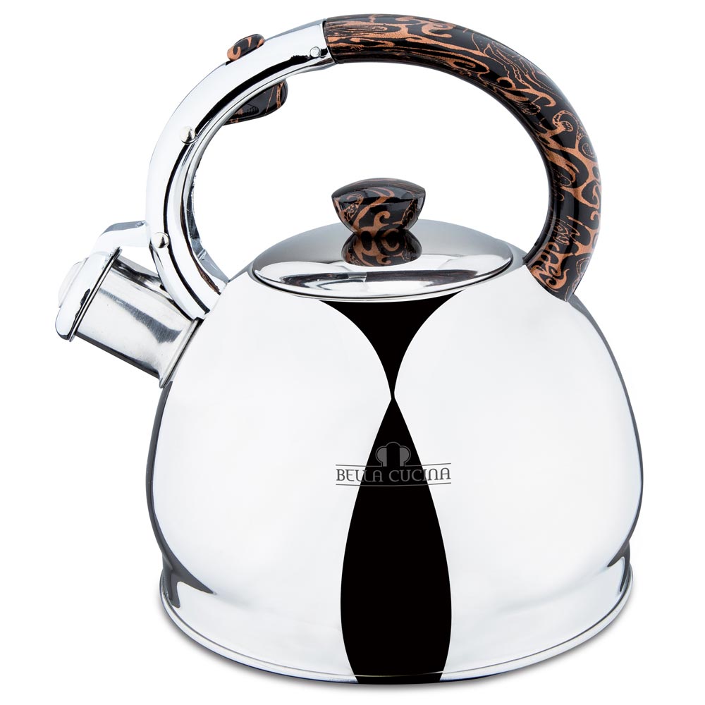 Чайник Bella Cucina 1051-BC оснащен бакелитовой ручкой и свистком, громко оповещающим о закипании воды. Свисток имеет механизм подъема на ручке, это позволит защитить вари пальцы от ожога.