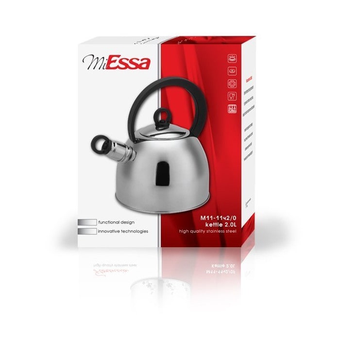 Чайник из нержавеющей стали с зеркальной полировкой корпуса. Термоаккумулирующее дно, позволяющее накапливать и равномерно распределять тепло; свисток сигнализирующий о достижении температуры кипения.