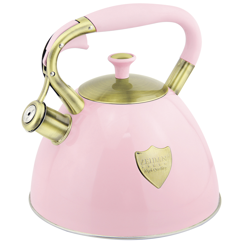 Чайник со свистком рассчитан на 3,0 л, изготовлен из нержавеющей стали, капсулированное индукционное дно, курковый механизм, внешнее покрытие - антипригарное цветное покрытие, устойчивое к высоким температурам, комбинированная ручка с покрытием "soft-touch", декоративные элементы "под бронзу".