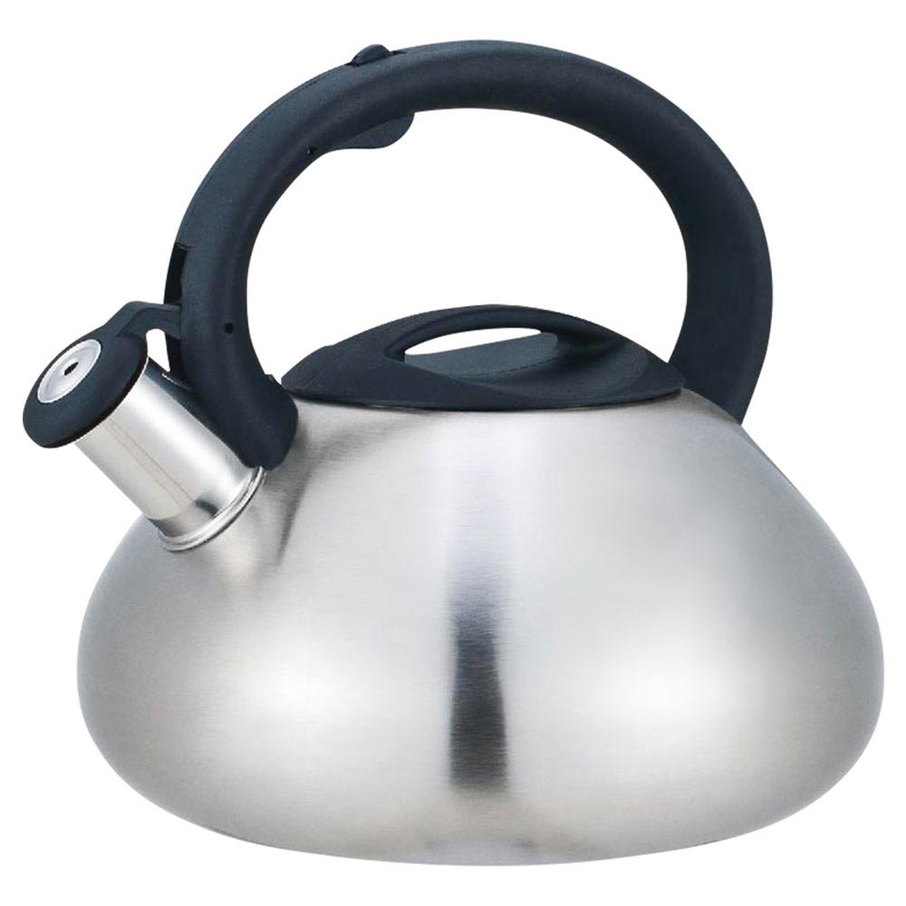 Чайник снабжен свистком и устройством для открывания носика, которое находится на ручке.