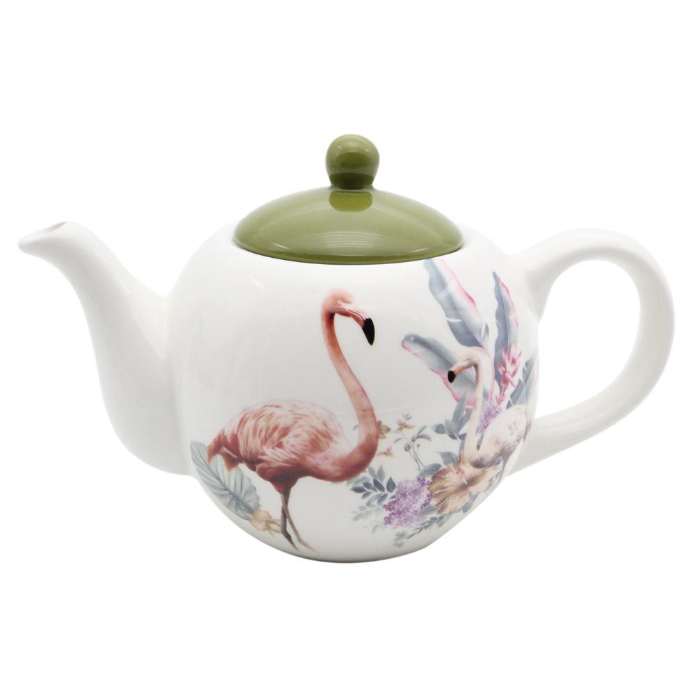 Чайник "Фламинго" изготовлен из высококачественного доломита с глазурованным покрытием и оформлен красочным изображением.