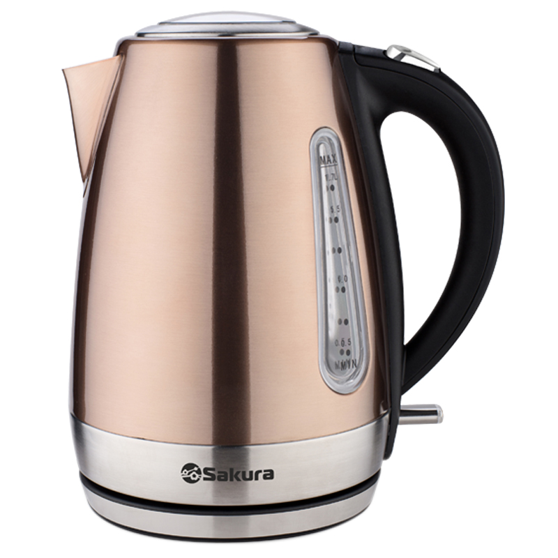 Электрический чайник Sakura SA-2133Z имеет солидный объем 1,7 л, хватит для всей семьи. Корпус чайника изготовлен из нержавеющей стали с золотым декоративным покрытием, на нём имеется шкала уровня воды. Изделие оснащено дисковым основанием с закрытым нагревательным элементом, индикатором работы, съемным моющимся фильтром. Чайник снабжен защитой от включения без воды и системой автоматического отключения при закипании.