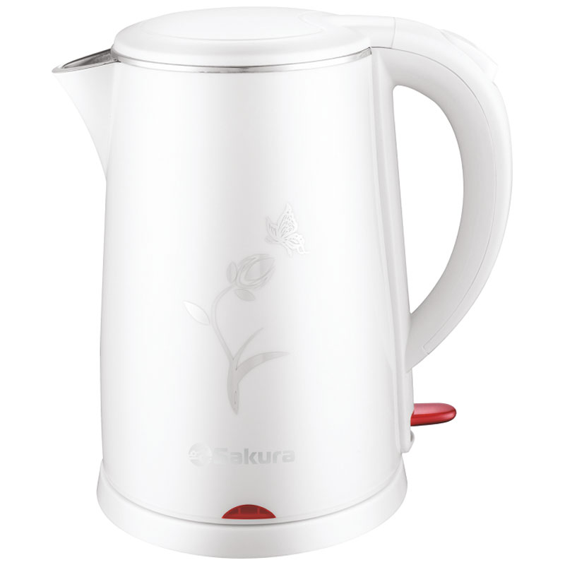 Чайник электрический Sakura имеет объем 1.8 л, 1800-2000Вт, дисковый нагревательный элемент, двухслойный корпус, эффект термоса (быстрее нагревается и дольше удерживает тепло).