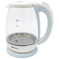 Стеклянный чайник с дисковым нагревательным элементом, отключение при закипании и включении без воды.