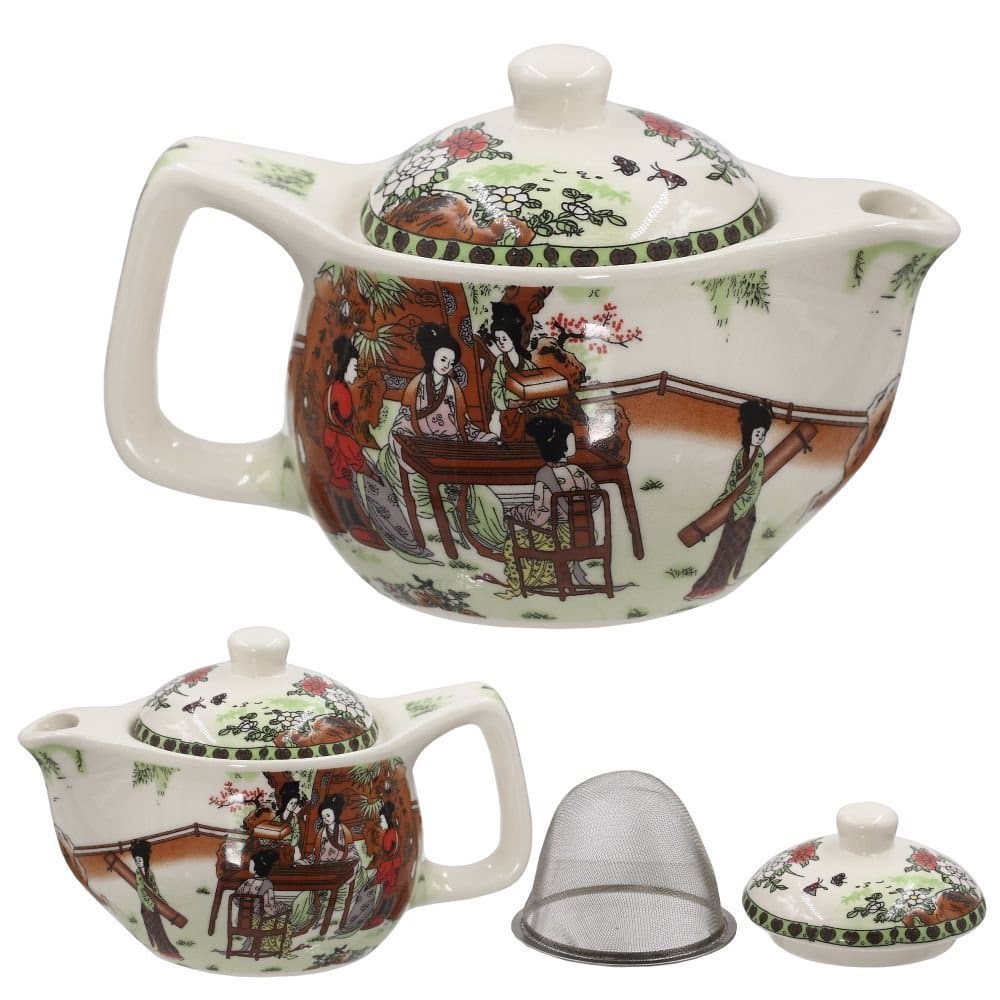 Чайник с фильтром изготовлен из фарфора. В комплекте есть металлическое ситечко, которое упростит процесс заваривания и мытья чайника.