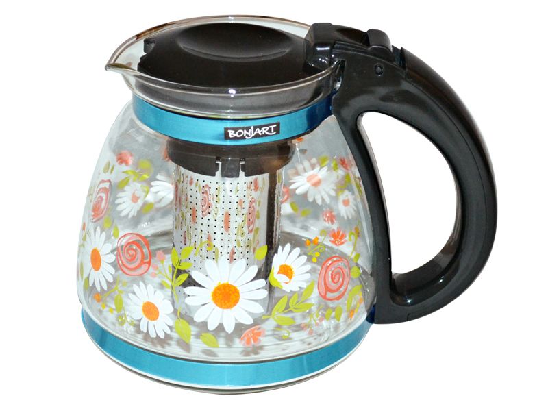 Заварочный чайник объемом 1500мл, выполнен из жаропрочного стекла, на корпус нанесена яркая деколь, металлический фильтр.