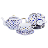 КОБАЛЬТОВАЯ СЕТКА, набор чайный (13) 6 чашек 250мл + 6 блюдец + чайник, NEW BONE CHINA, декор ситец, подарочная упаковка