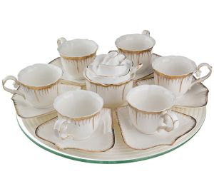 Комплект выполнен из высококачественного фарфора; материал отличается особой белизной и гладкой текстурой. При этом он достаточно прочен и надежен, не содержит компонентов, которые могут повлиять на вкус напитка.