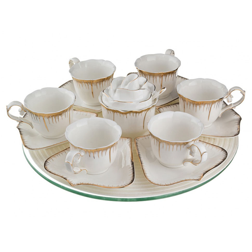Комплект выполнен из высококачественного фарфора; материал отличается особой белизной и гладкой текстурой. При этом он достаточно прочен и надежен, не содержит компонентов, которые могут повлиять на вкус напитка.