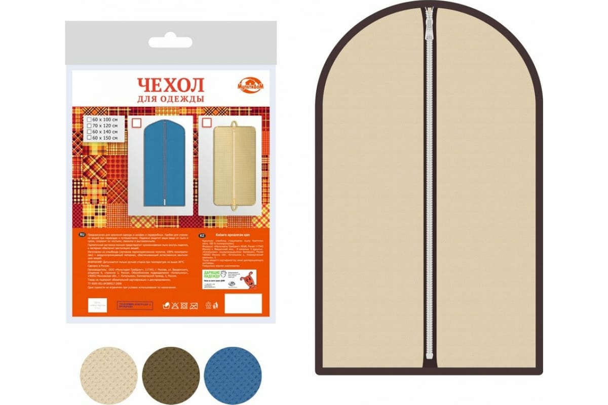 Воздухопроницаемый материал чехла защищает меховую и верхнюю одежду от пыли и моли, синий цвет препятствует проникновению ультрафиолетовых лучей и пожелтению изделия.