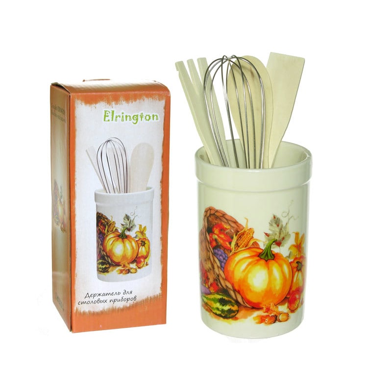 Держатель для столовых приборов Тыква в подарочной упаковке. В комплекте деревянные кухонные принадлежности: ложка, вилка, лопатка и металлический венчик.