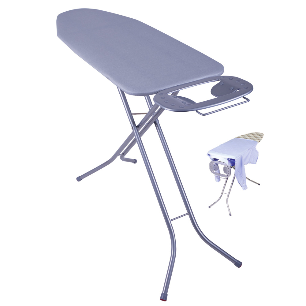 Поверхность рабочего стола гладильной доски Eurogold Flipper изготовлена из цельнометаллического перфорированного листа, защищенного от деформации в период эксплуатации. Предусмотрена плавная регулировка высоты до 95 см, подставка под утюг.