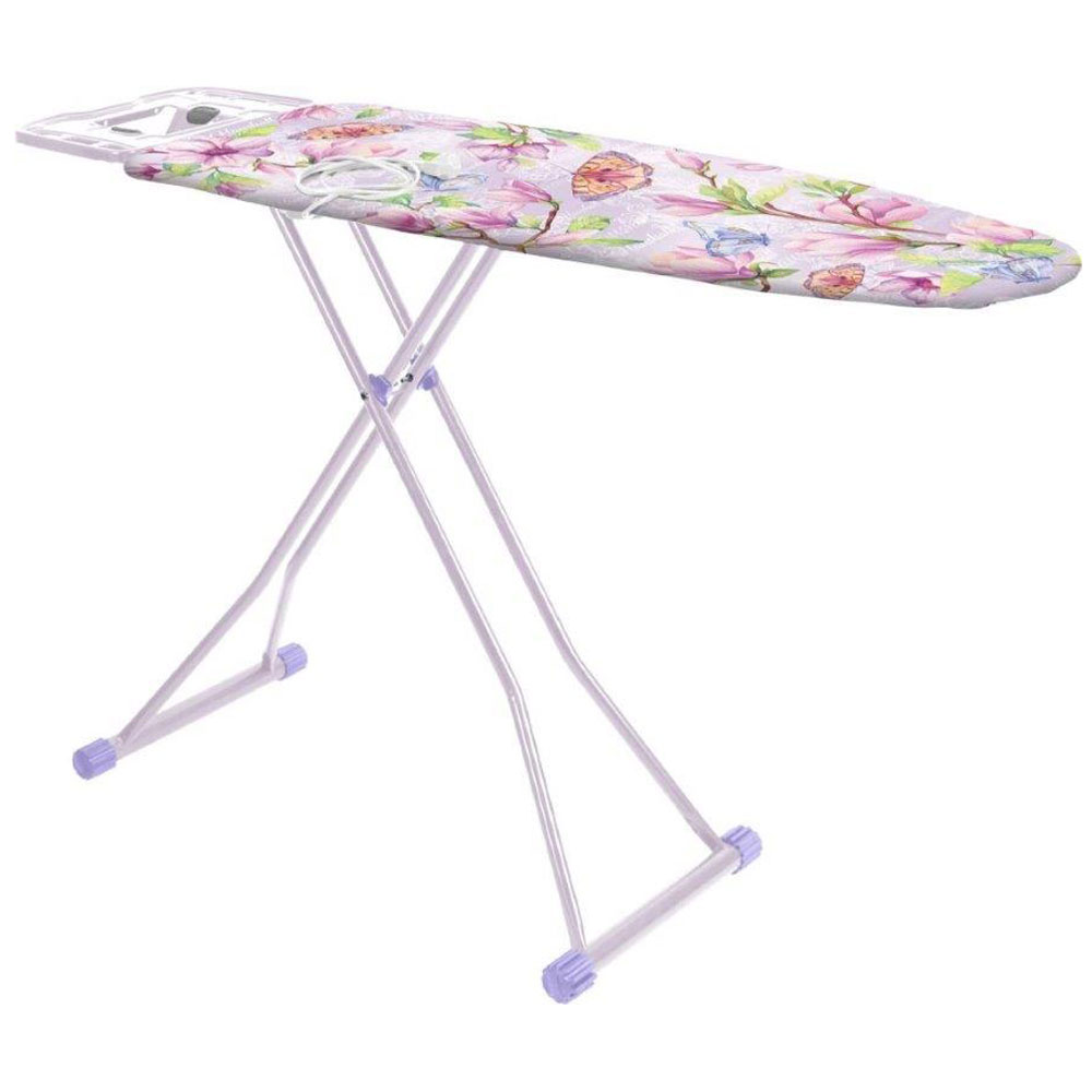 Доска гладильная — металлическая основа (1230х460 мм), перфорированная поверхность обеспечивает свободное прохождение пара, универсальная широкая европодставка под утюг и парогенератор, высота плавно регулируемая до 0,95м, сертифицированная электророзетка и электросоединитель 1,5 м с держателем для провода утюга, удобная полка для белья.