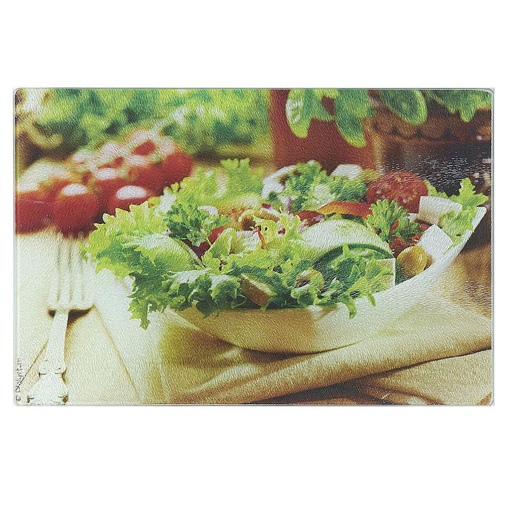 Разделочная доска "Греческий салат" изготовлена из жаропрочного стекла.