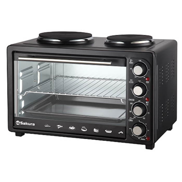 Духовка электрическая Sakura объемом 30 л, 3200 Вт, мощность 1500 Вт, механическое управление, 3 режима работы духовки, 2 чугунные конфорки мощностью 1000Вт+700 Вт, 180 мм + 145 мм.