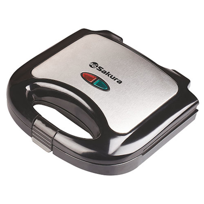Электрогриль Sakura мощностью 750 Вт, корпус изготовлен из черного пластика и нержавеющей стали, 2 металлические рифленые панели для жарки, размер панели 210х115 мм, антипригарное покрытие, световой индикатор работы/нагрева, защита от перегрева, фиксатор ручек, вертикальное хранение, прорезиненные ножки.