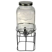 Лимонадник представляет собой стеклянную банку объемом 4 литра с декором, которая оборудована удобным краном-дозатором. Установлена емкость на металлическую подставку, чтобы каждый за столом мог легко дотянуться до дозатора.